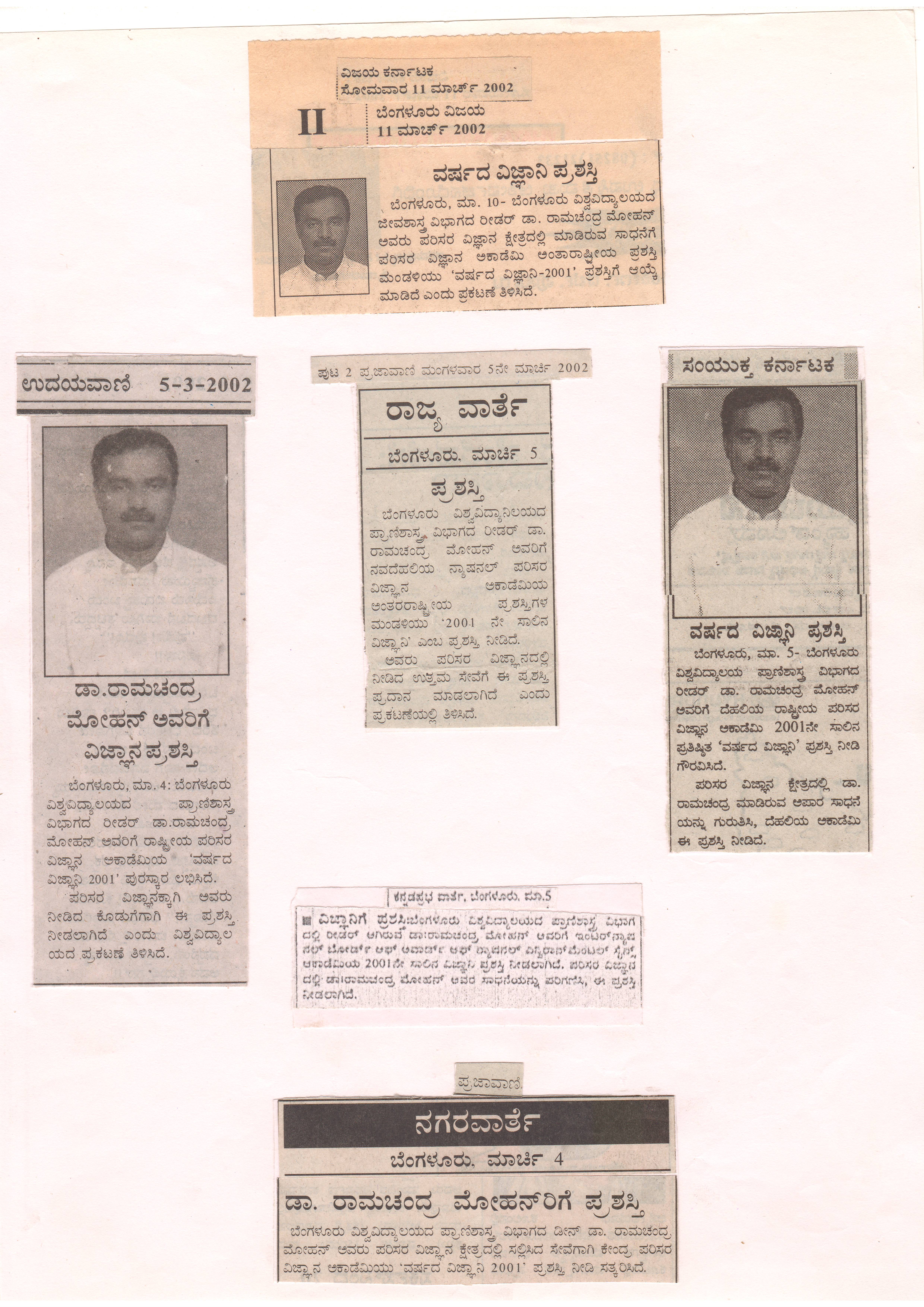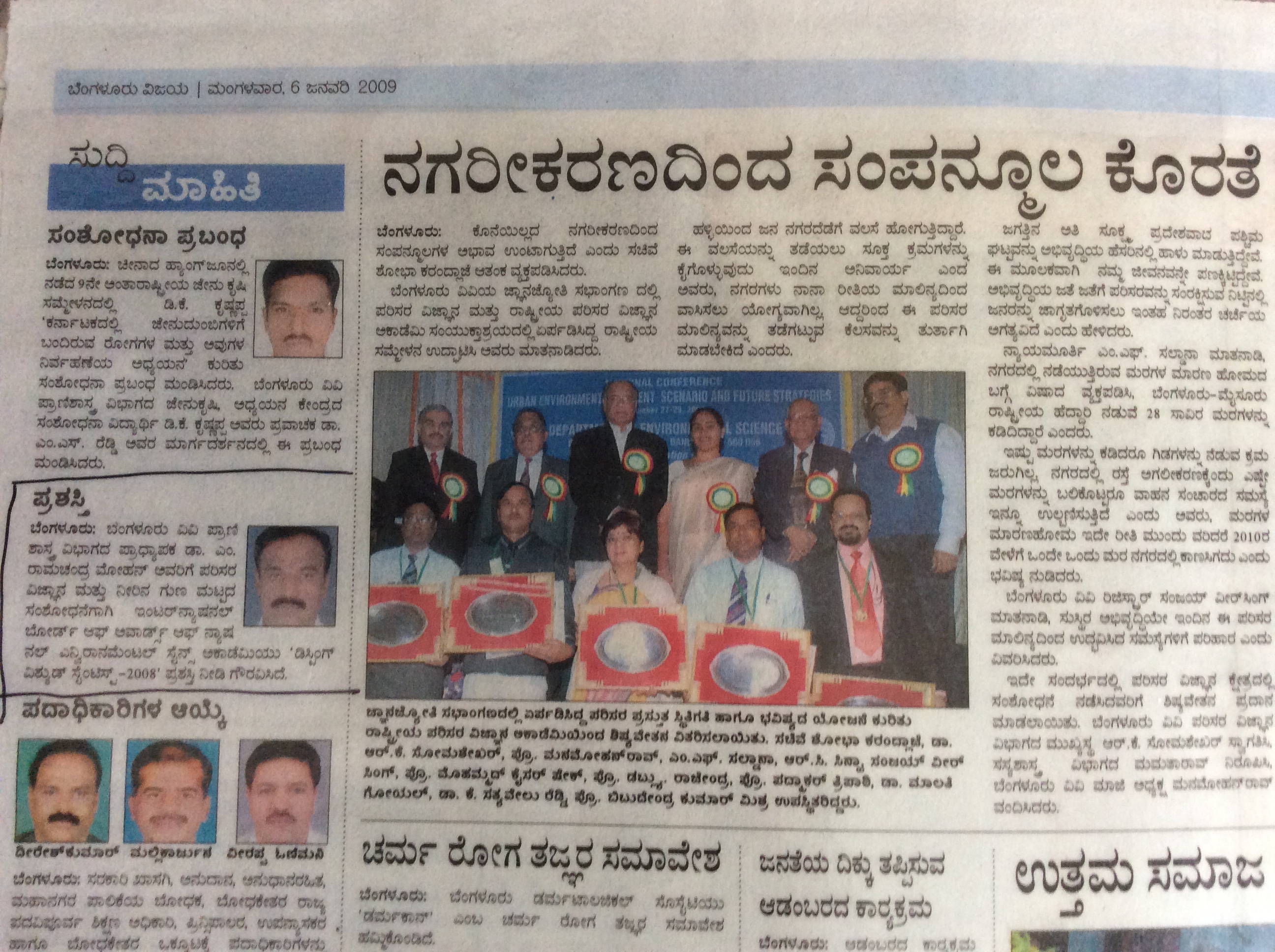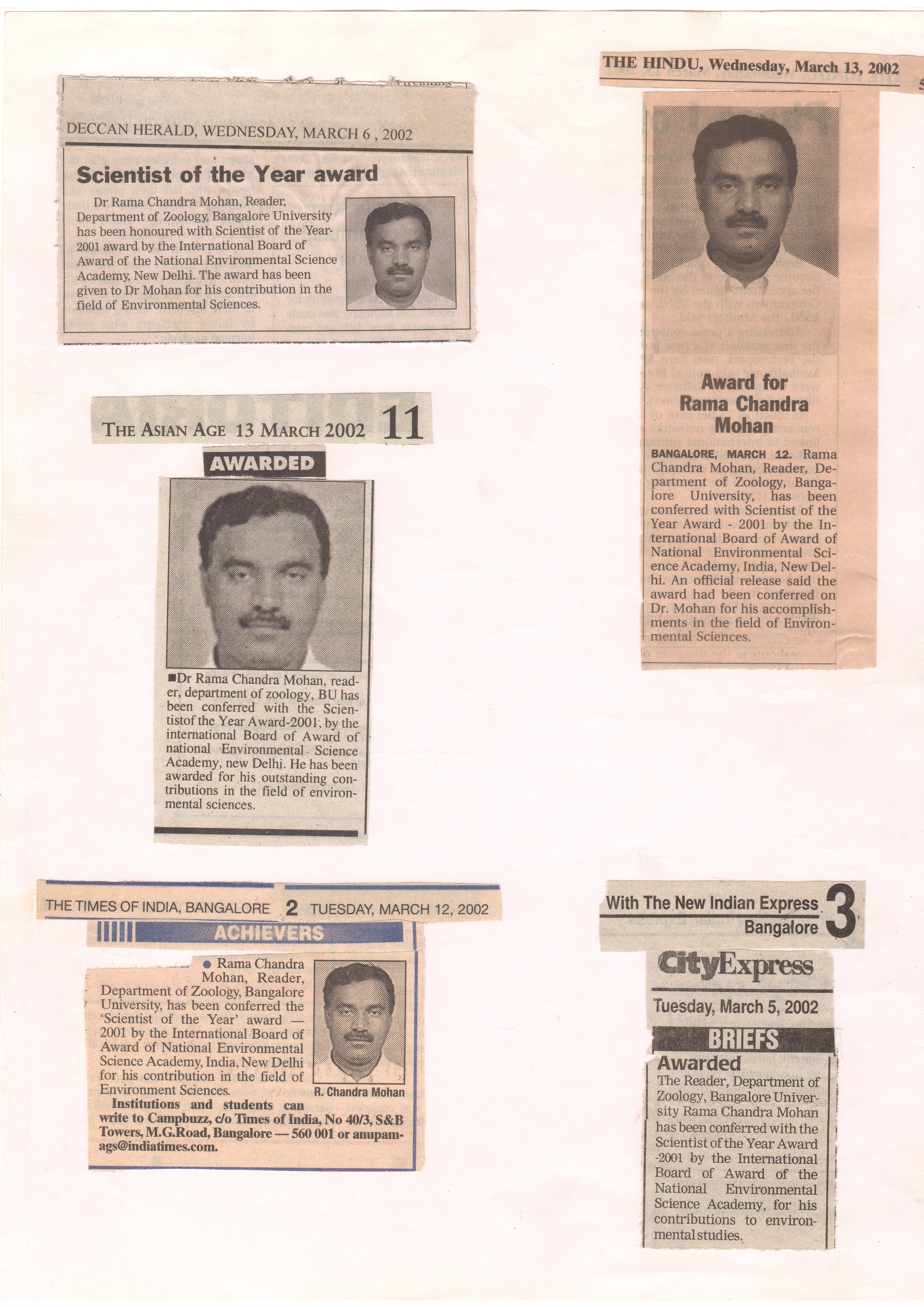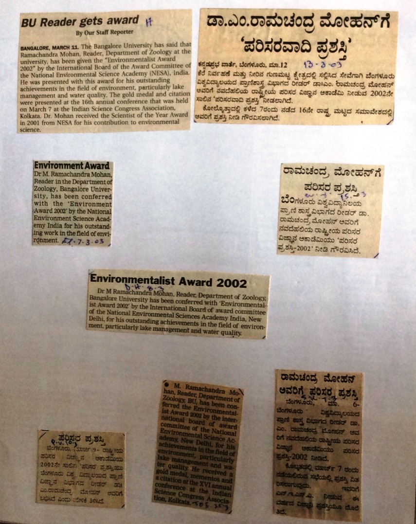 Prof. Mohan was awarded G.P. Chatterjee Memorial National Award. (Dept. of Science and Technology, Govt. of India) (News Clippings), View List and he carried out post-doctoral research at Ceske Budejvice, Czech republic, 1997 and also worked as Post-Doctoral Research Fellow at Osaka Otsu, Japan,2001. With the funding support of UNEP and ILEC. He won Best Research Award as Distinguished Scientist of the Year Award – 2008, Environmentalist of the Year Award – 2002, Scientist of The Year Award – 2001.