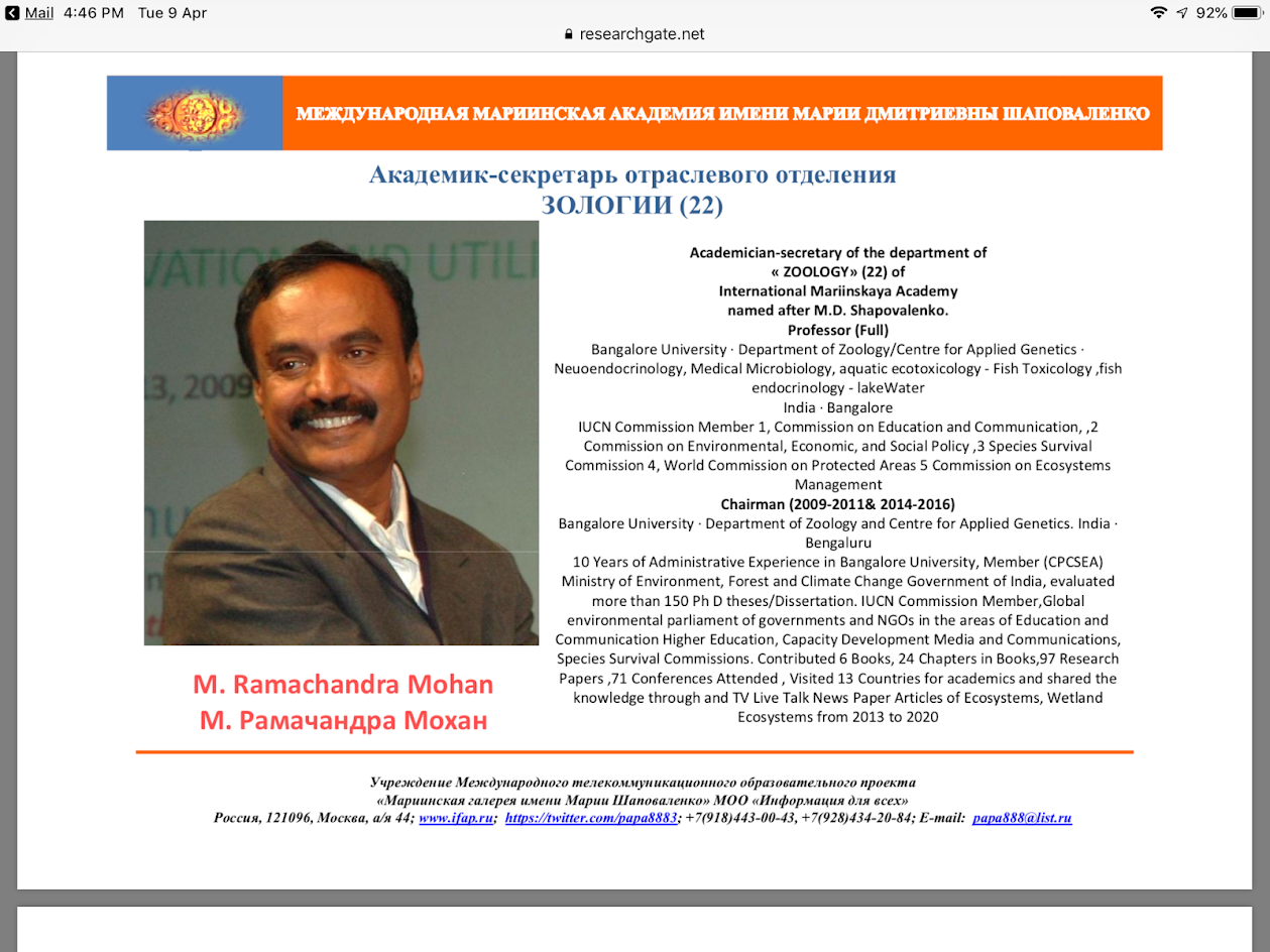 Academician-Secretary of the department of ZOOLOGY (22) of International Mariinskaya Academy RussiaView